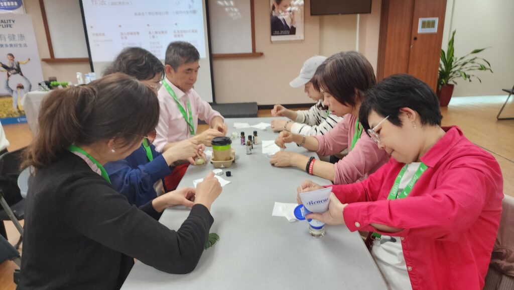 緊接著,精油芳療老師鄭淑智老師帶來實用又暖心的精油實作課程—「精油護手霜」。用茶樹精油/生薑精油/天竺葵精油/甜橙精油/舒緩滋養乳液,大家親手調製給自己的感恩節禮物 🎁,不僅滋潤雙手,也像溫柔的擁抱傳遞到心裡。