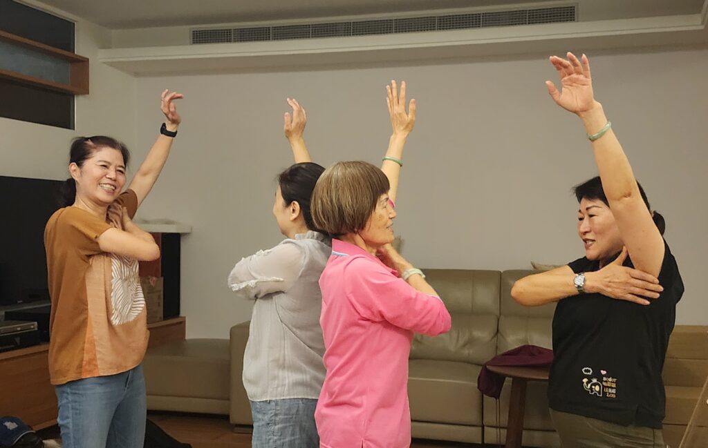 今天天氣雖然陰雨綿綿,但一點也澆不熄「不老鼓手」們的熱情! 一大早,大家精神飽滿地展開暖身,拍打雲門穴與腋下淋巴,正式開啟活力滿滿的一天。