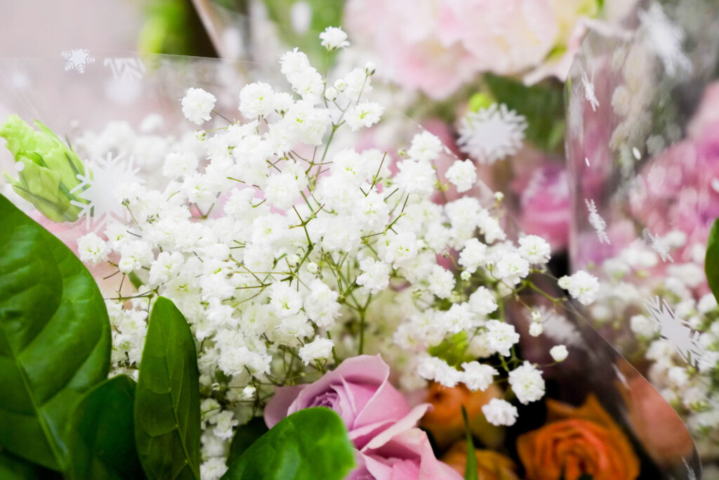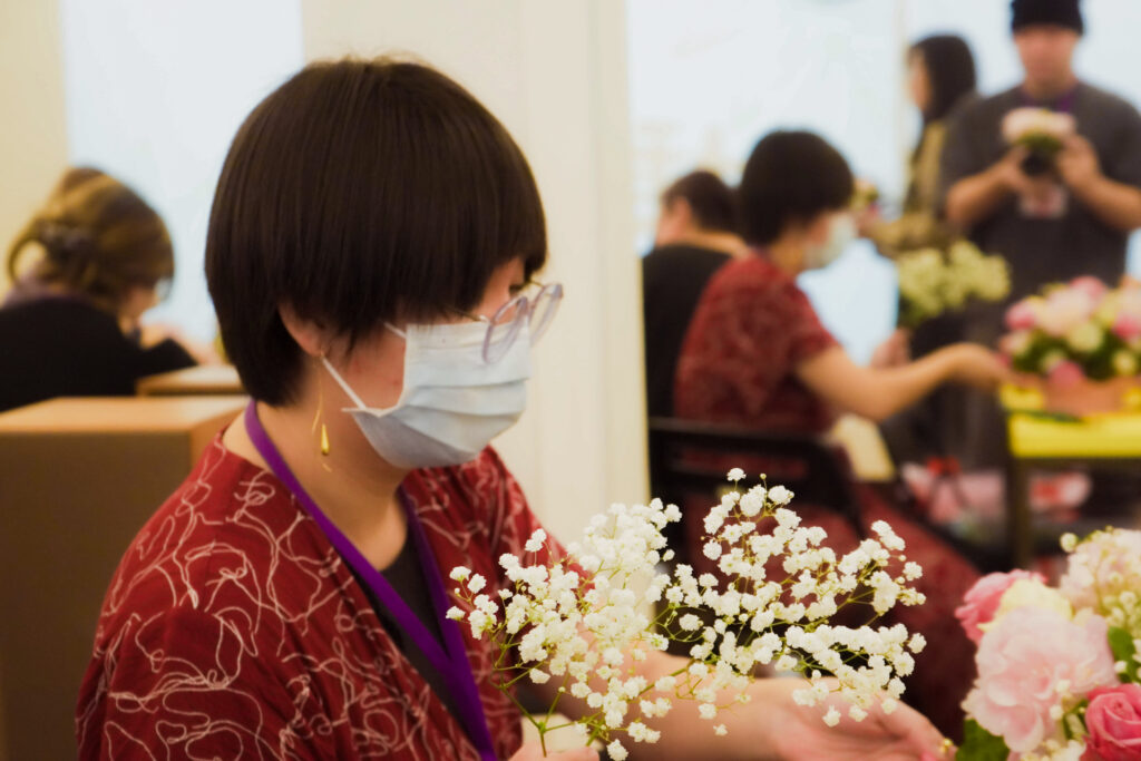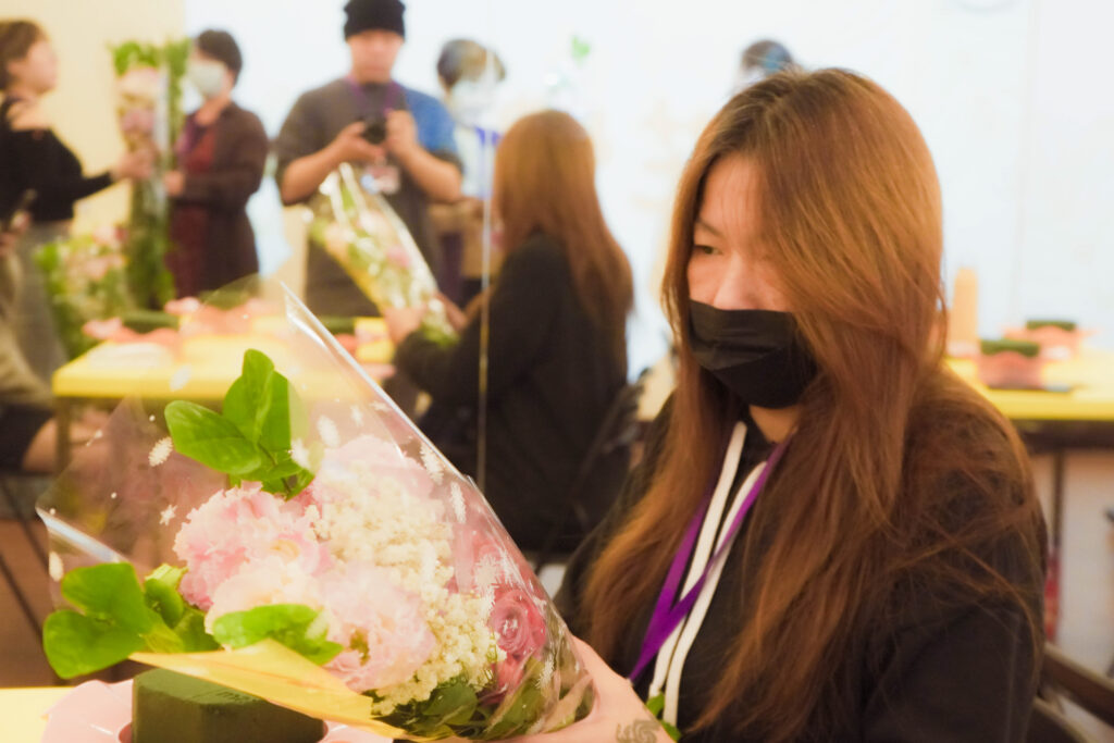 在反覆嘗試與修正的過程中~學員們也慢慢學會分辨主花與輔花的角色。玫瑰可以成為視覺焦點,但並不代表每一朵花都必須搶眼;桔梗可以拉出高度與層次,有高有低,畫面才會流動;滿天星不站在中心,卻能溫柔地陪襯整體;茉莉花葉則安靜地撐起結構,讓作品更穩定。