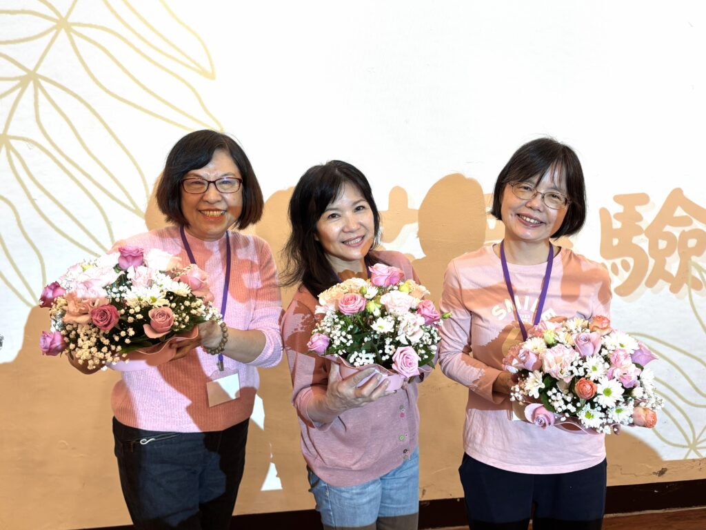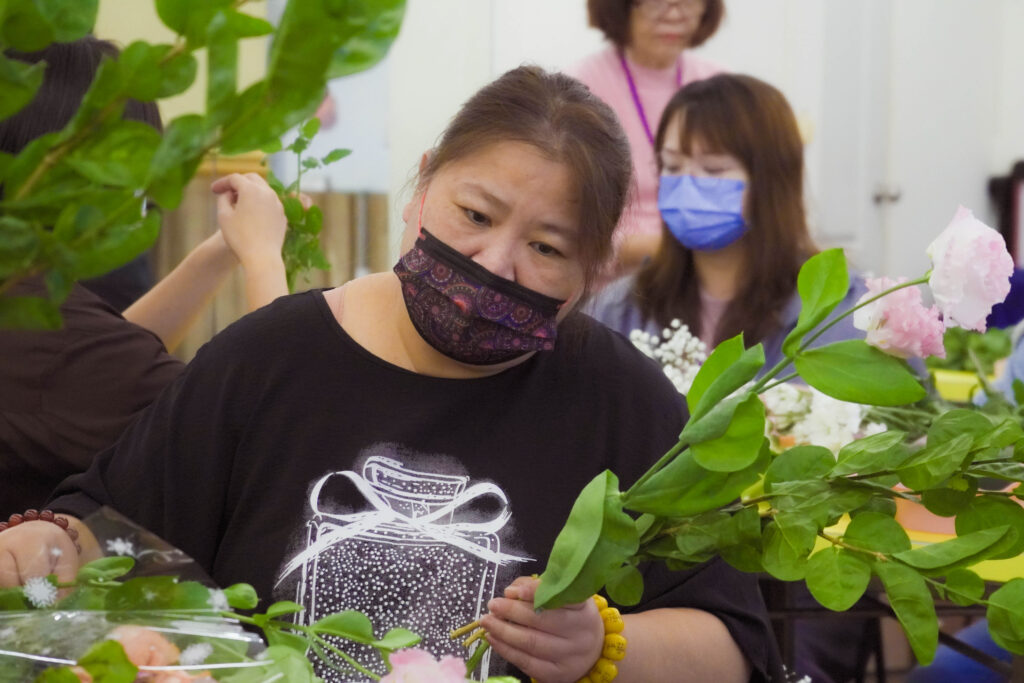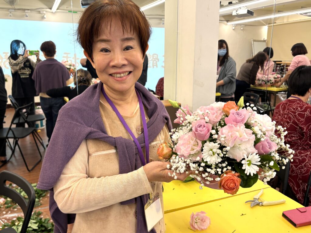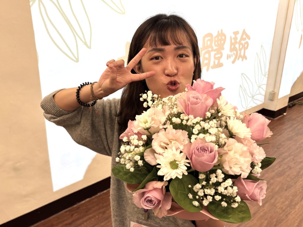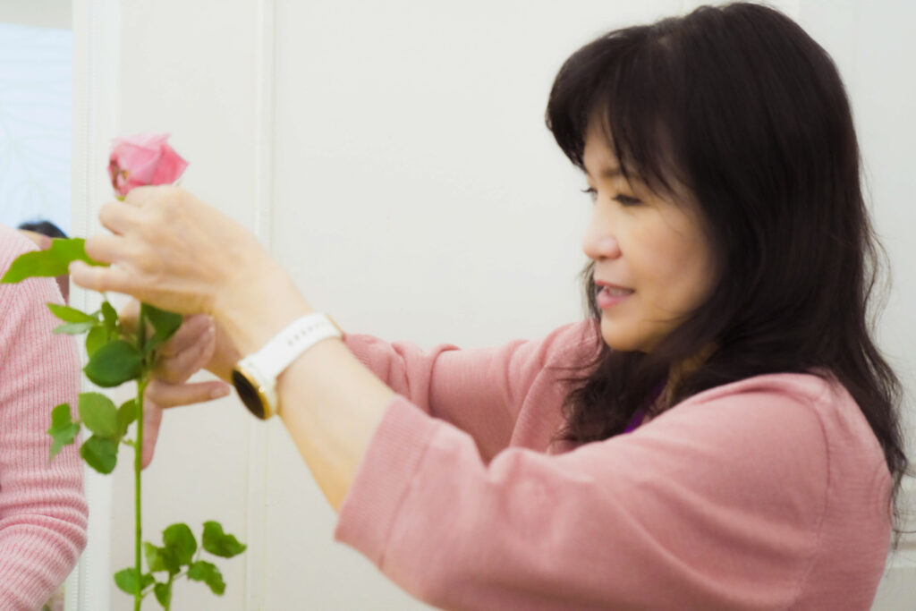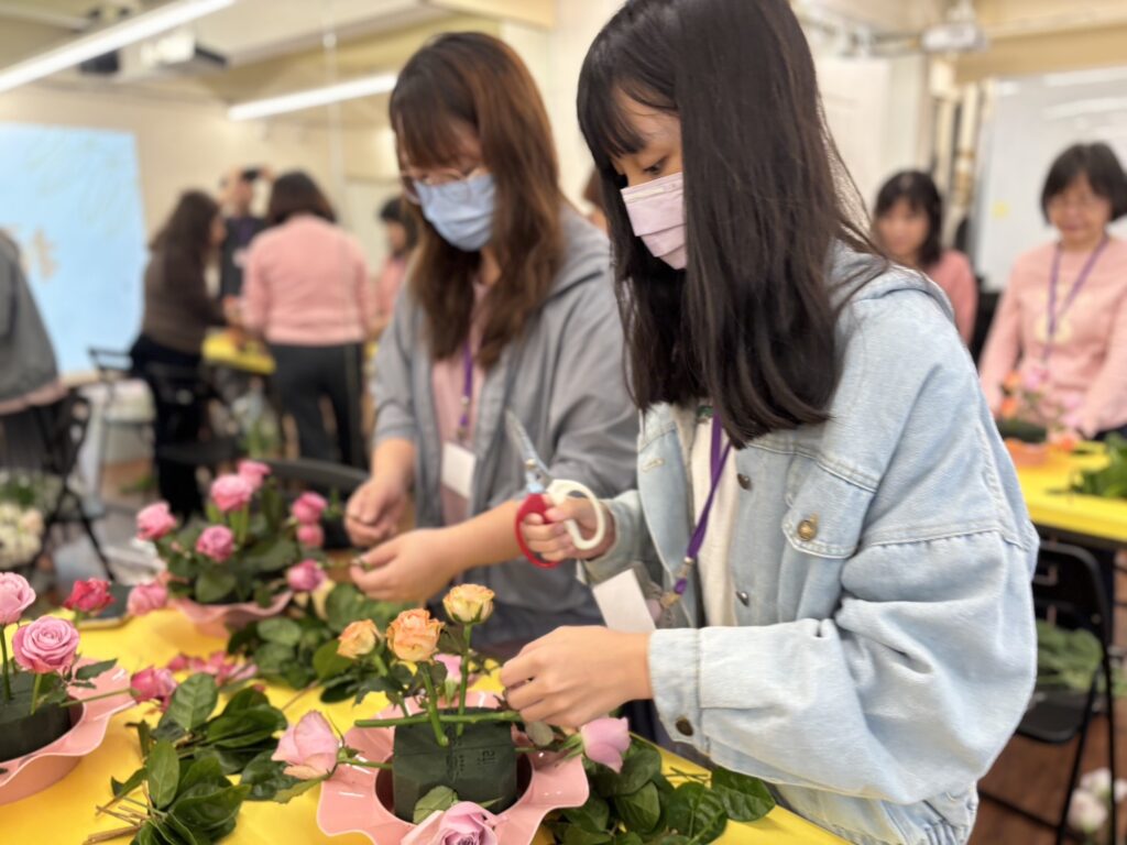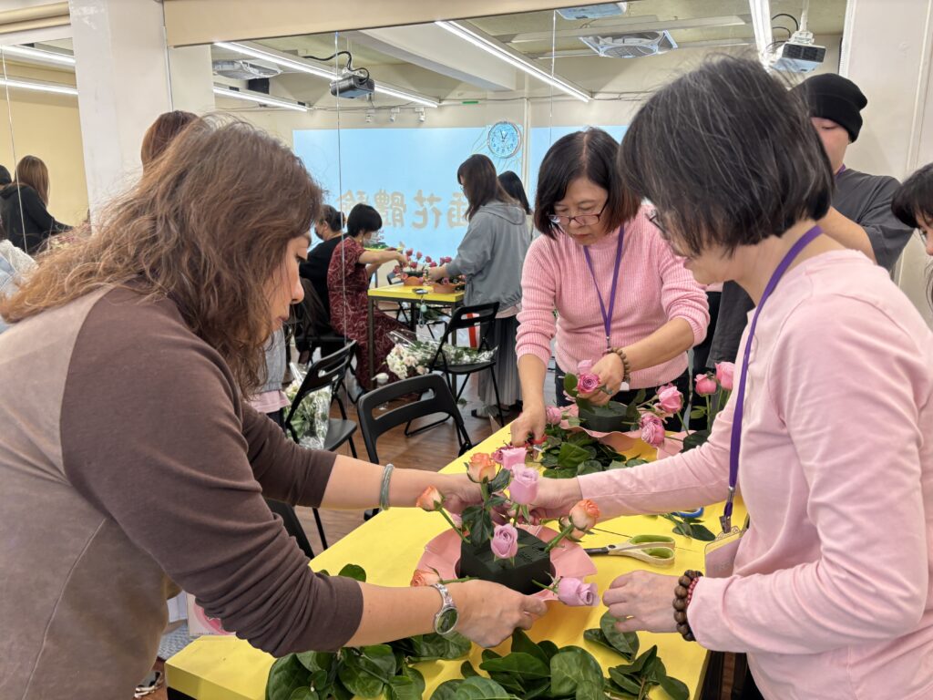 美慧老師沒有急著要求完成,而是從最基本的地方開始——如何修剪✂️花枝、如何觀察花材的長短與生長方向,並示範以「對角線」的方式放入第一朵花。隨著一朵朵花被慢慢放進花盤,大家逐漸理解:花藝並不是把花插滿,而是透過高低、前後與疏密的安排,讓作品自然地「呼吸」🍃🍃🍃