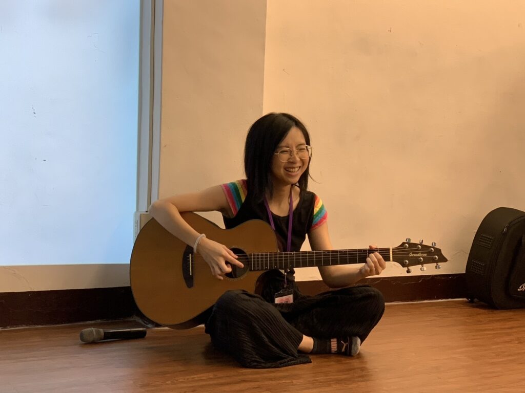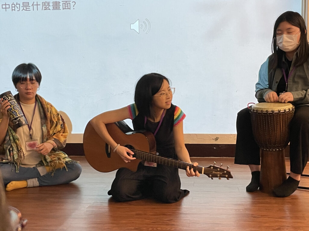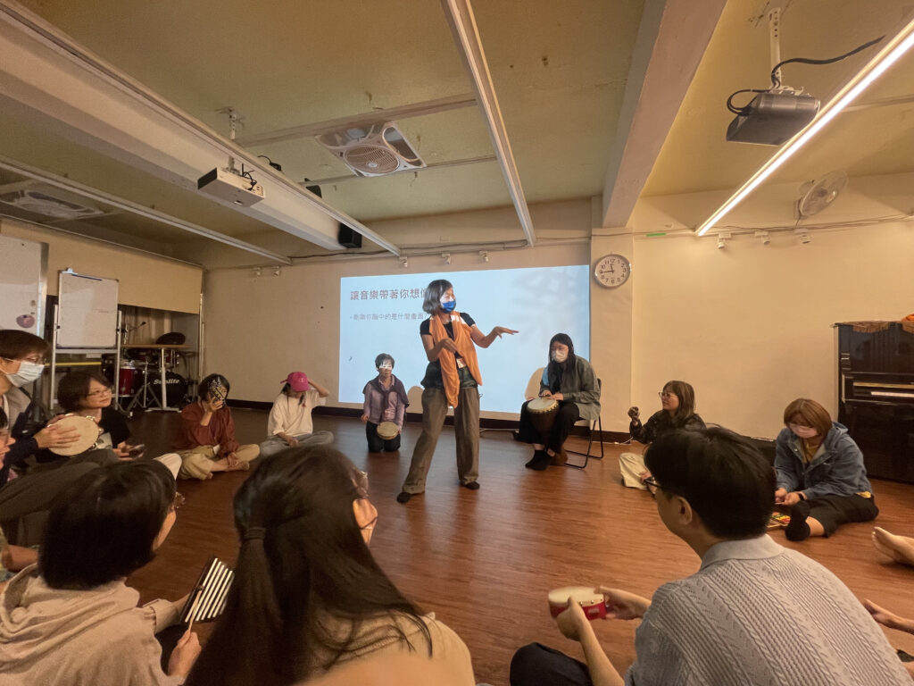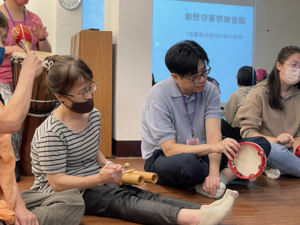 老師讓大家自由選擇手中的樂器,有人拿起鈴鼓,有人挑選沙鈴,也有人嘗試木魚、鐵琴、雷鳴鼓。起初,大家仍帶著些許緊張與保留,身體隨節奏輕輕搖擺,卻略顯拘謹,直到邱老師彈起吉他、唱出第一段清亮的旋律,空氣忽然柔軟了起來。