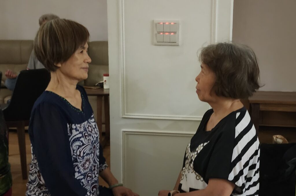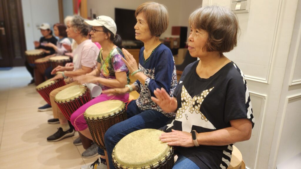 大家邊唱邊打,節奏整齊又充滿活力,每一下鼓點都像心跳在說:「我們還年輕、還有力氣、還有愛!」現場的能量像浪潮一樣翻滾,連牆壁都在跟著共鳴。
